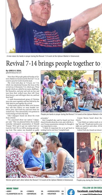 Are you asking what's next? I am. We have lit a spark in Greenwood and we need to fan it into something bigger, something God-sized. We only have 68 people on this Facebook Page. We probably had triple that attend our Prayer Vigil / Revival tonight and don't have a way to connect with them directly. So, I'm asking for your help in reaching out to the Pastors, ministers and folks who attended or who want to know "what's next" and let's find another time and place and let's invite even more and let's Do It Again! How does Monday, July 14th sound at 7:14 pm again!!? That is right after Greenwood's Festival of Discovery.